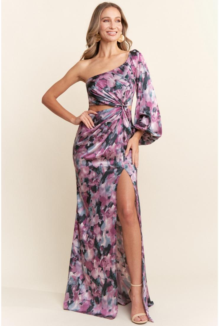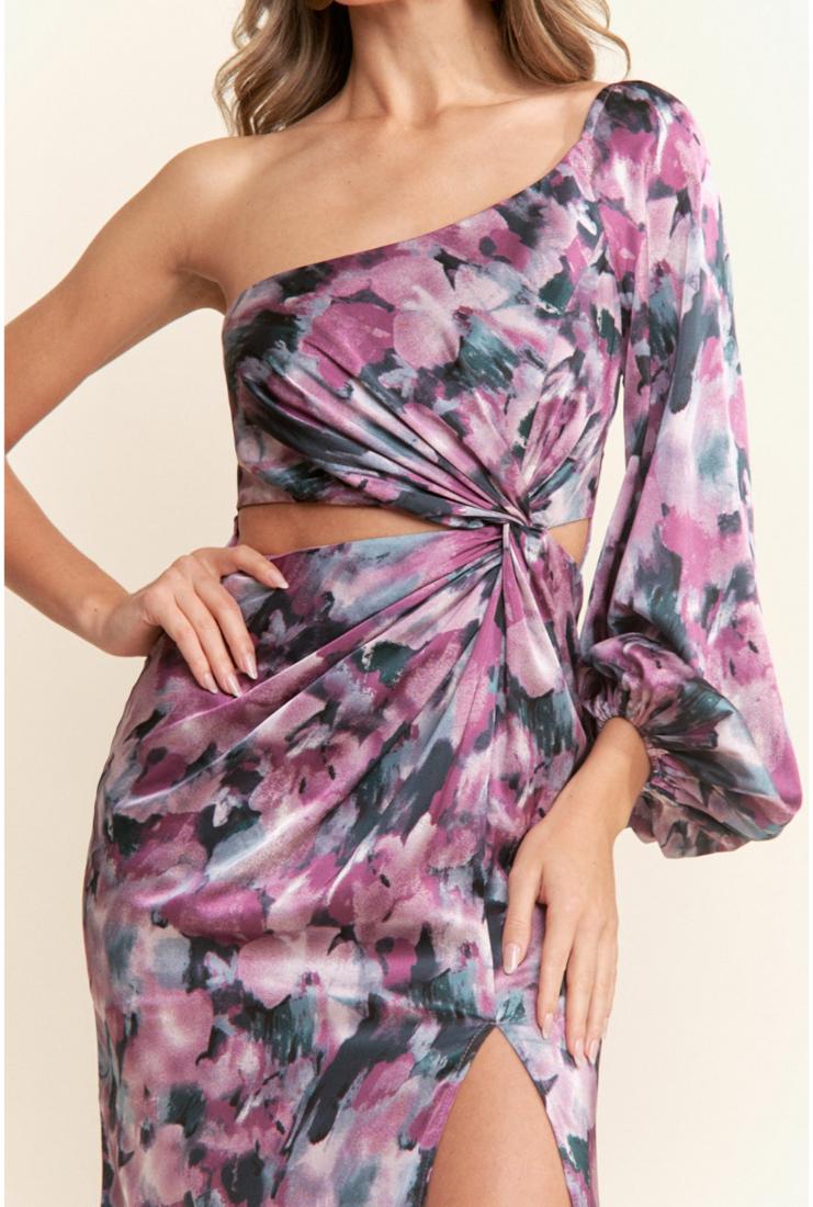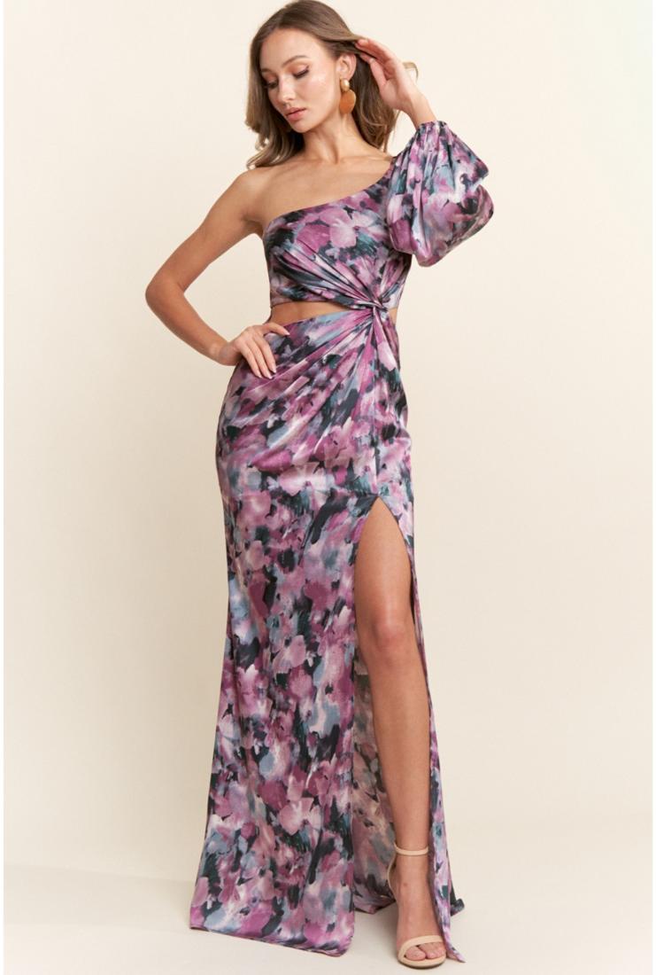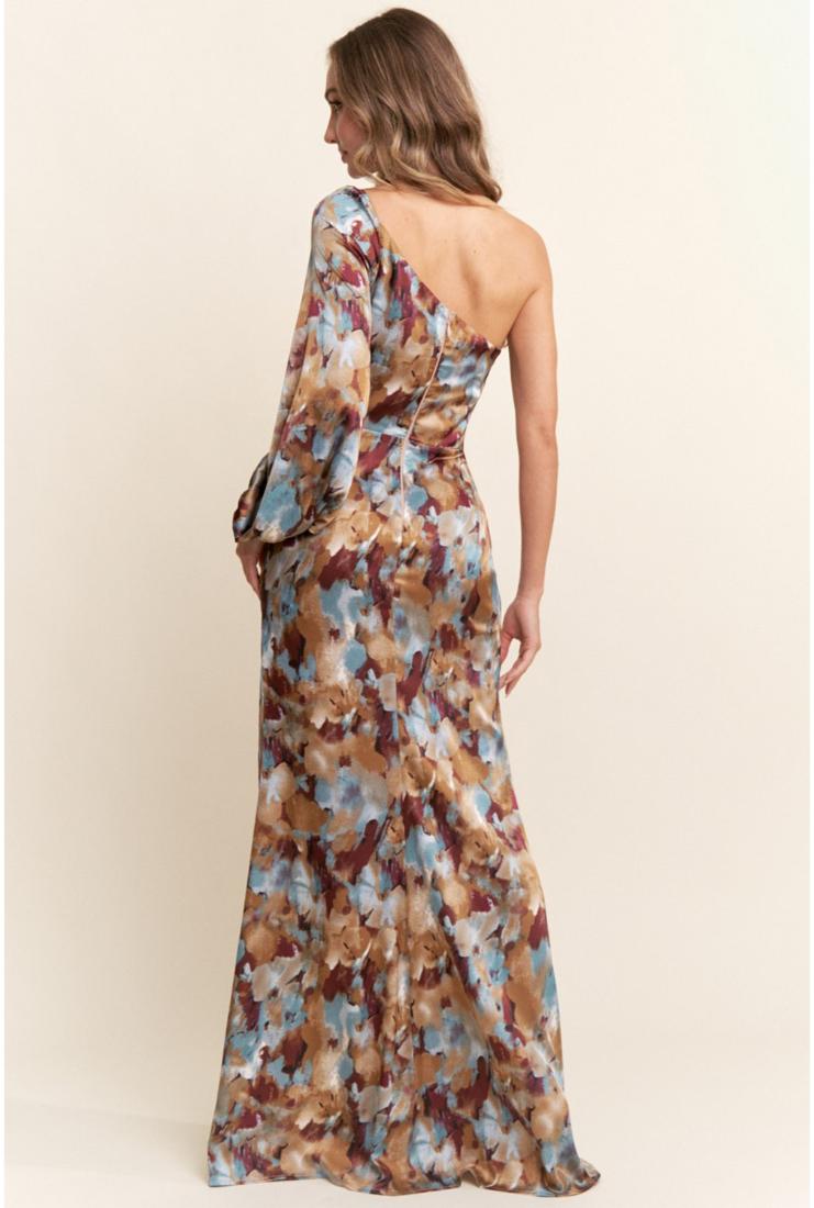 Amara One Shoulder Abstract Floral Satin Maxi Dress