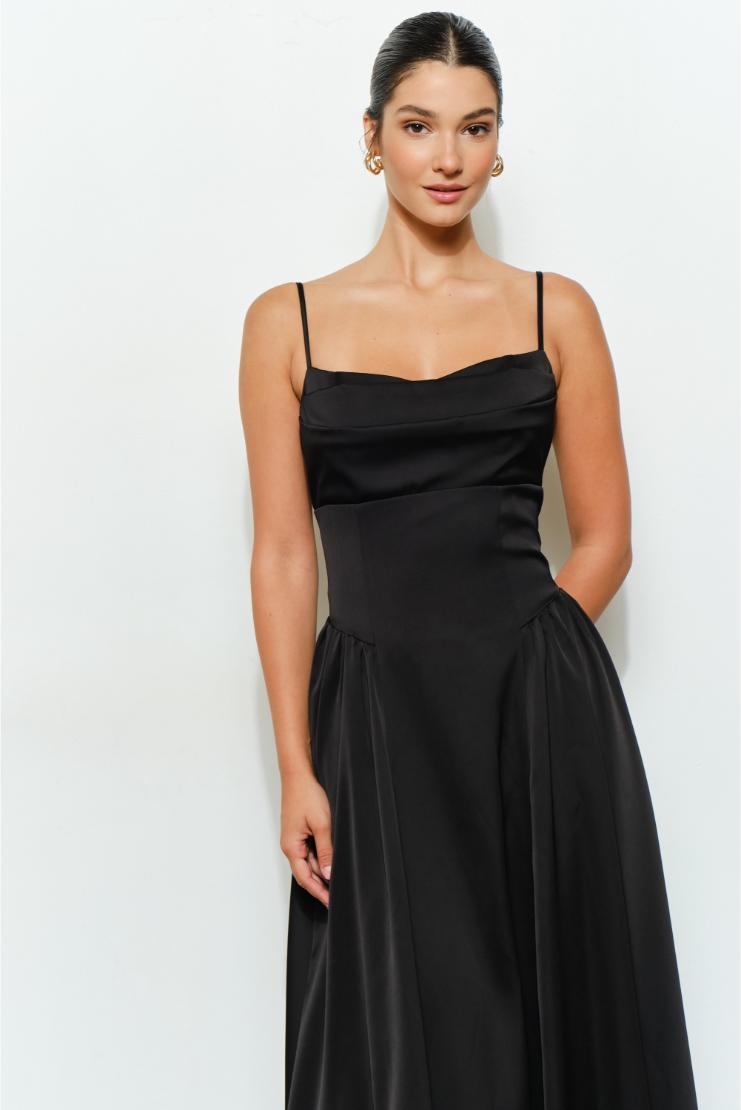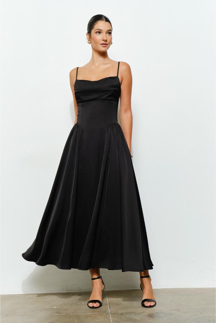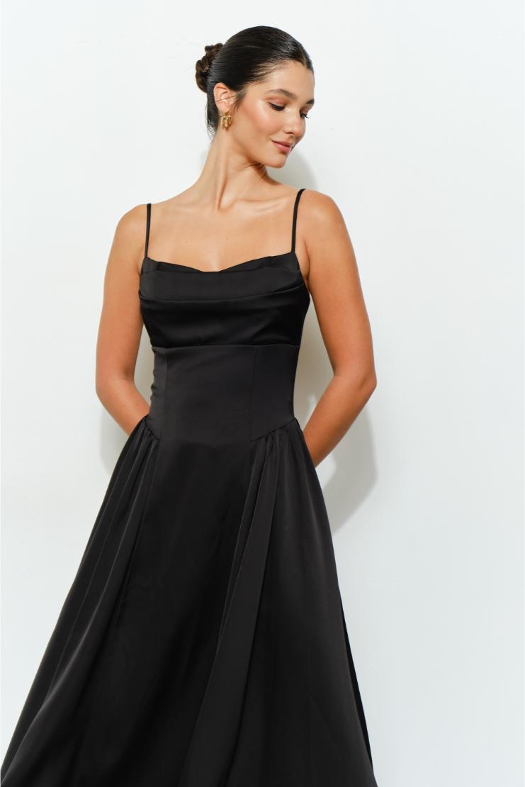 Slip into effortless sophistication with the Jessie Satin A-Line Midi Dress. This striking black design features luxurious satin fabric that catches the light with every move, while the flattering A-line silhouette skims your curves and elongates your frame. The midi length strikes the perfect balance between bold and refined, making it ideal for evening events, date nights, or whenever you want to command attention. Pair it with heels and statement jewelry to unleash your most confident self.