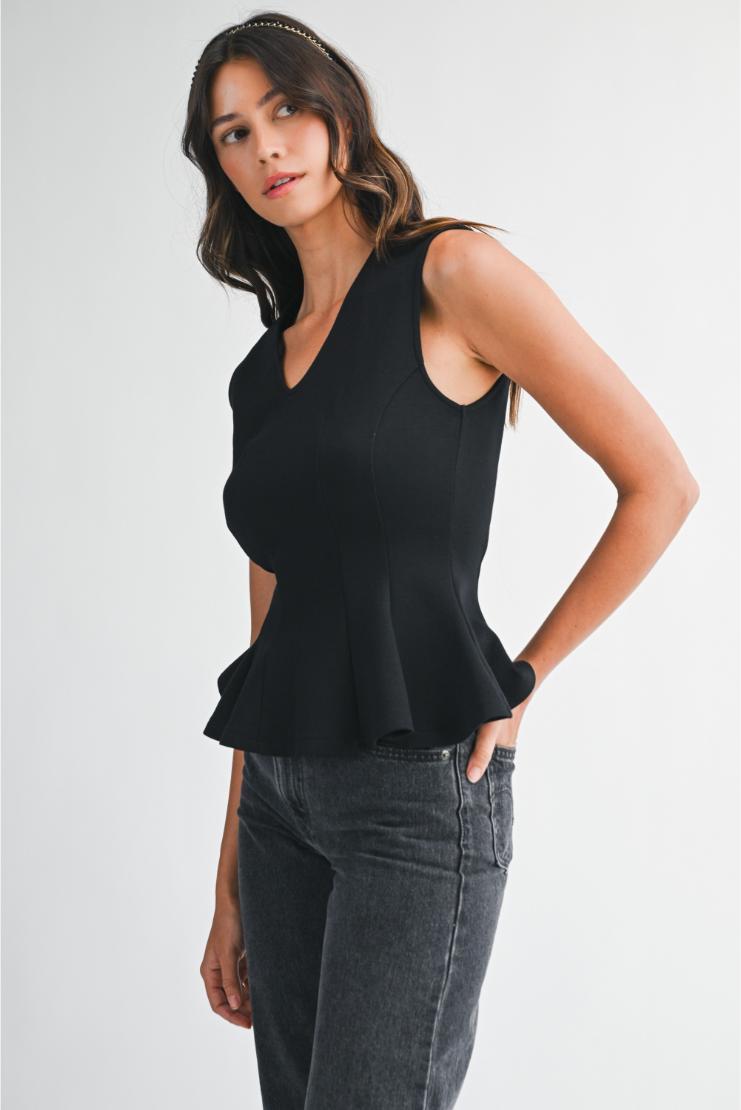 The Kayla Sleeveless V-Neck Peplum Top delivers sophisticated style with its flattering silhouette. The deep V-neckline elongates the frame while the structured peplum waist creates dimension and visual interest. Crafted for versatility, this sleeveless design transitions seamlessly from office to evening occasions. The clean white colorway pairs effortlessly with tailored trousers, skirts, or layered under blazers for polished, professional looks. A wardrobe essential that combines contemporary design with timeless appeal.
