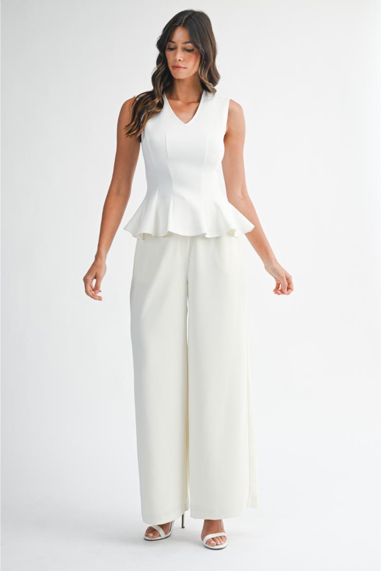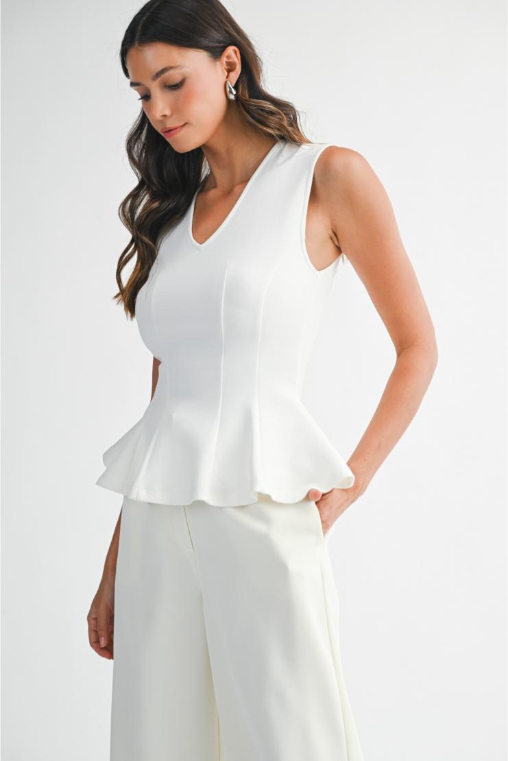 The Kayla Sleeveless V-Neck Peplum Top delivers sophisticated style with its flattering silhouette. The deep V-neckline elongates the frame while the structured peplum waist creates dimension and visual interest. Crafted for versatility, this sleeveless design transitions seamlessly from office to evening occasions. The clean white colorway pairs effortlessly with tailored trousers, skirts, or layered under blazers for polished, professional looks. A wardrobe essential that combines contemporary design with timeless appeal.