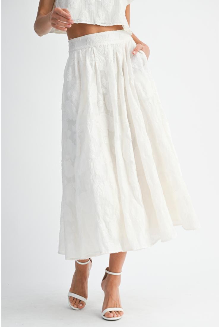 Step into sunshine with the Lola Florals Textured Midi Skirt and Crop Top Set in Ivory. This playful duo combines a breezy midi skirt with a charming crop top, both featuring delicate floral textures that add a touch of whimsy to your look. Perfect for twirling through summer days or making a statement at your next brunch, this set brings effortless style and a fresh, flirty vibe to your wardrobe.