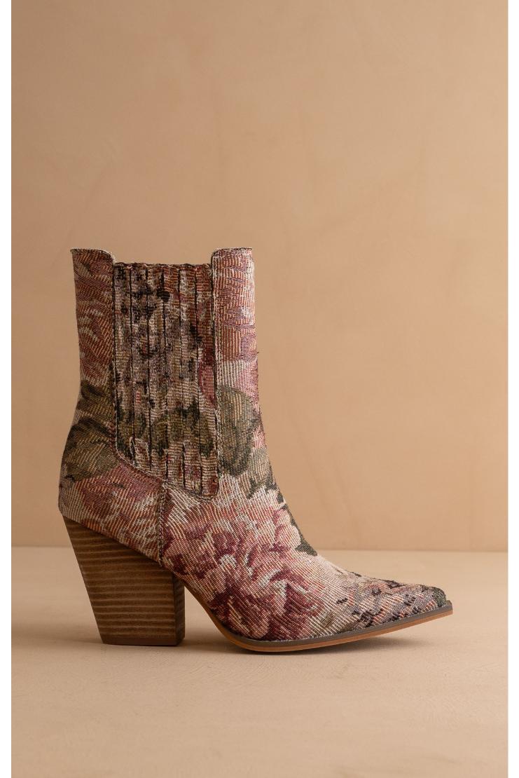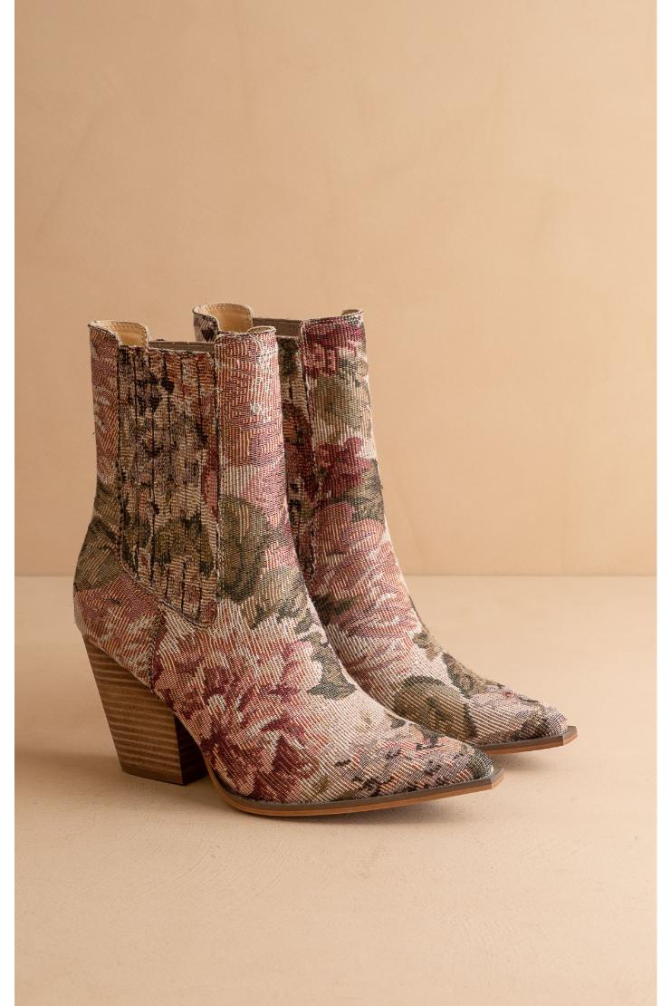 Embrace understated elegance with the Lydia Floral Print Suede Booties, where contemporary design meets timeless western inspiration. These slip-on booties showcase a luxurious textured suede upper with a refined pointed silhouette, complemented by tonal elastic goring for a graceful, personalized fit. The sturdy 3.5" stacked heel provides both comfort and polish, while premium atelier-curated materials ensure lasting quality. With a 6.5" shaft and 10.5" circumference, these versatile boots transition seamlessly from day to evening, adding sophisticated dimension to any wardrobe.