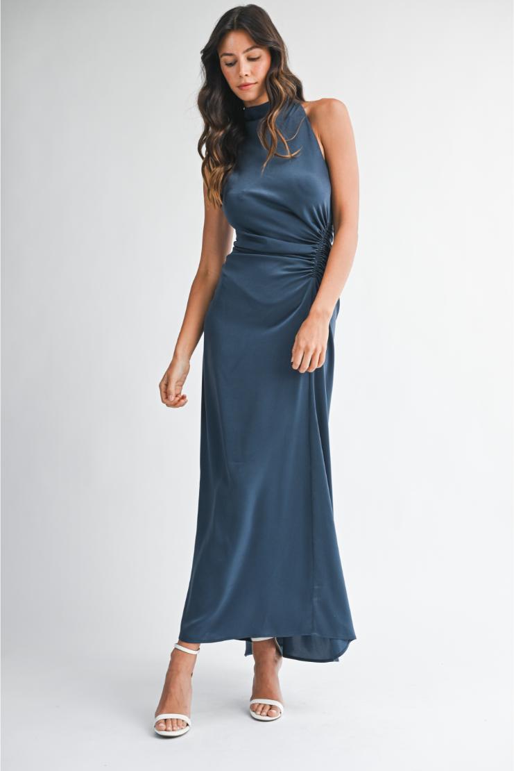 PRE-ORDER ETA JAN 1st! Kylee Mock Neck Side Ruched Satin Maxi