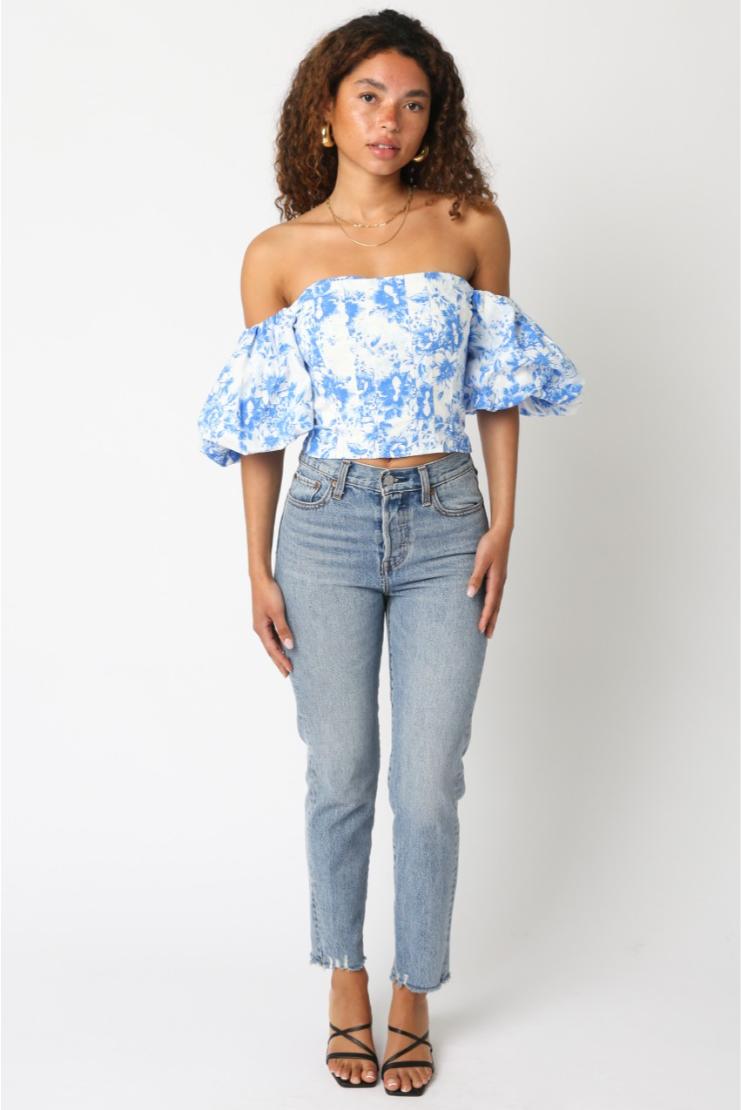 Embrace your feminine side with our Tiffany Floral Print Top in dreamy blue! This flirty off-the-shoulder design features adorable puff sleeves that add just the right amount of drama. Perfect for sunny brunches or evening strolls, this top pairs effortlessly with your favorite jeans or shorts for an instant style upgrade. Get ready for compliments!