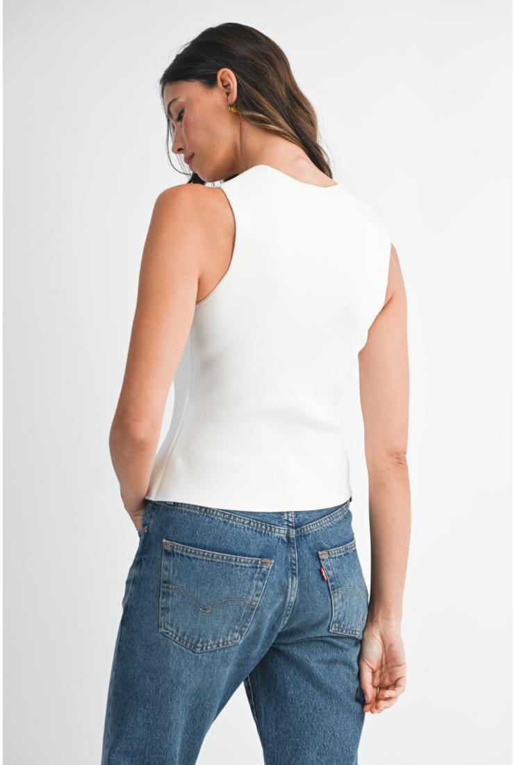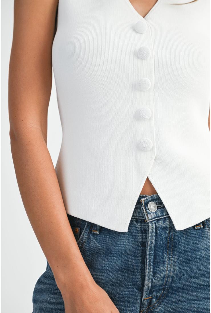 The Vivianna Knit Button Up Vest in white offers a refined layering option with its clean lines and classic button-up design. Crafted for both comfort and style, this vest elevates any outfit with its elegant simplicity, making it perfect for sophisticated, effortless dressing.